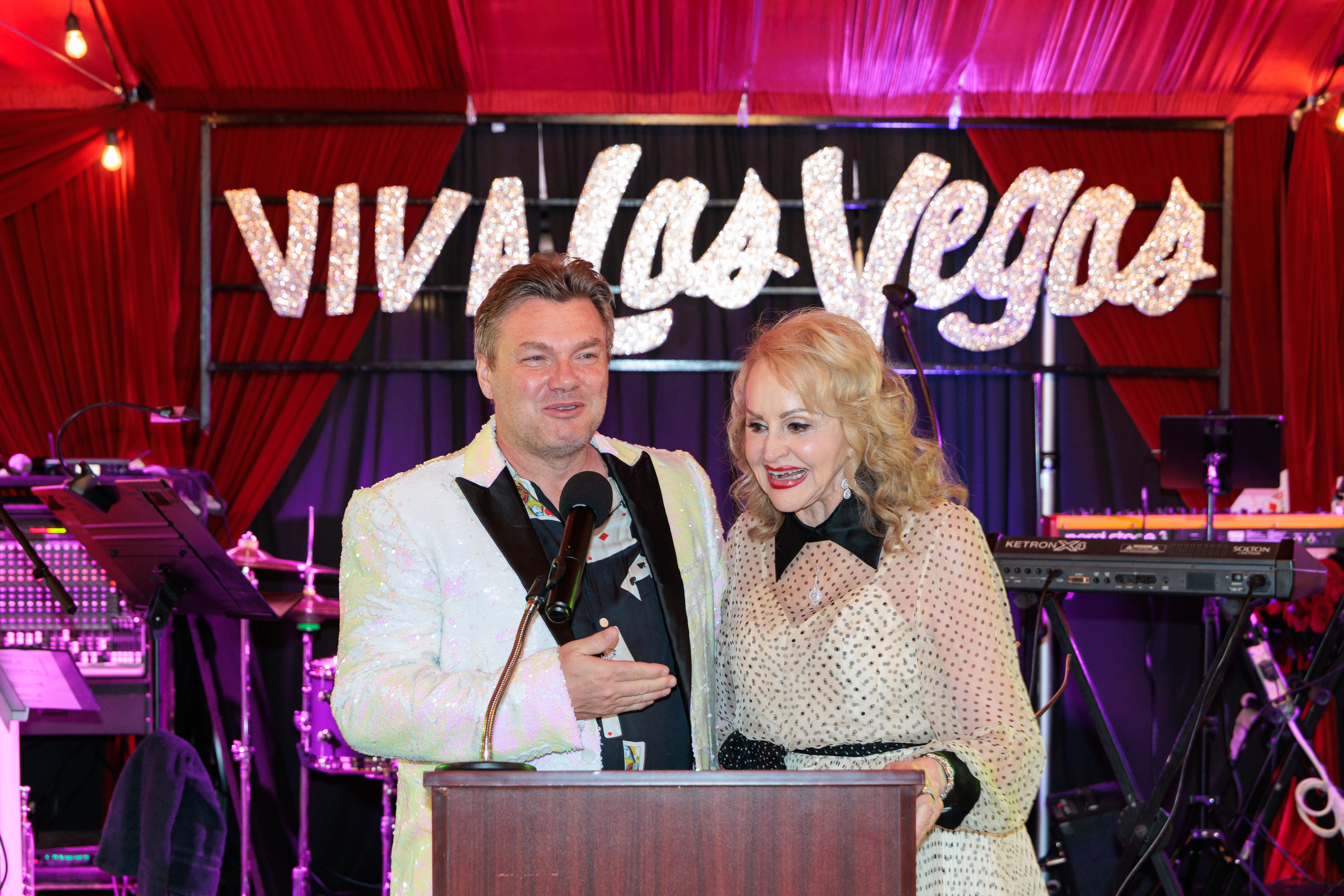 Chief Executive Brian Helleland and Marsha Moeller, hostess for the Vegas-themed REBELS event